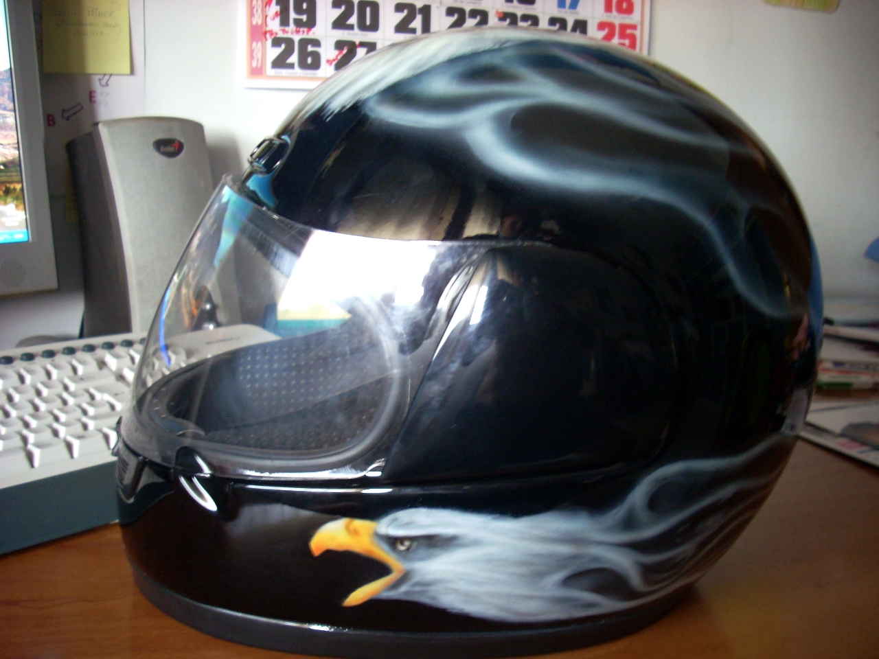 Casco de la marca rnt con funda ........... y diseño de aguila tanto en zona frontal com en los laterales
